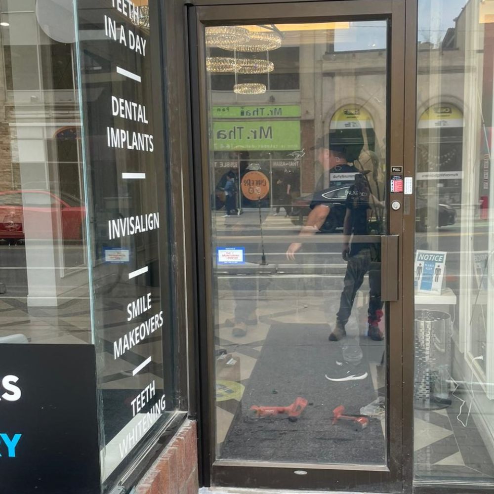 - Aluminum storefront swing doors: single and double, with or without sidelites and transoms. The most common commercial door type in Toronto retail and office buildings.